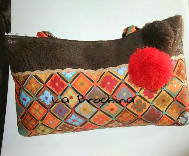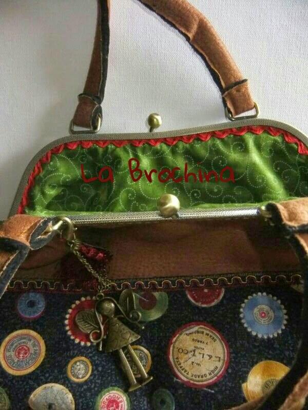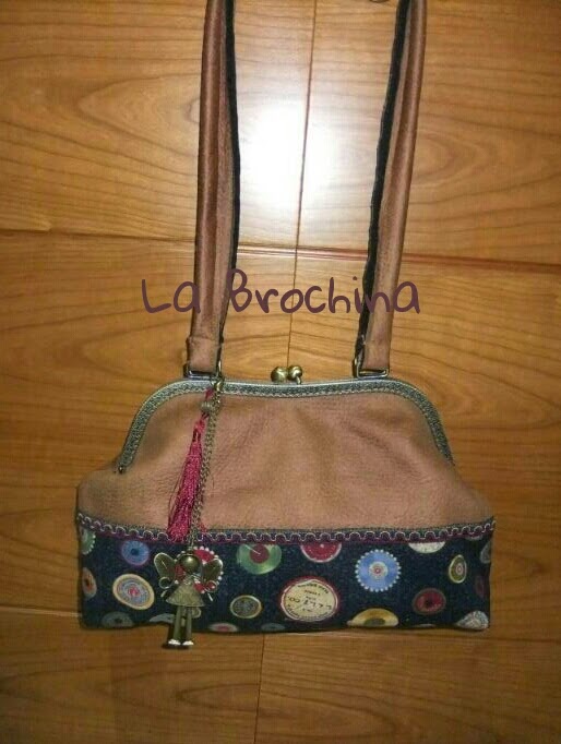 Bolso con boquilla metalica, en polipiel combinada con una floreada tela de algodón, forrado de la misma tela