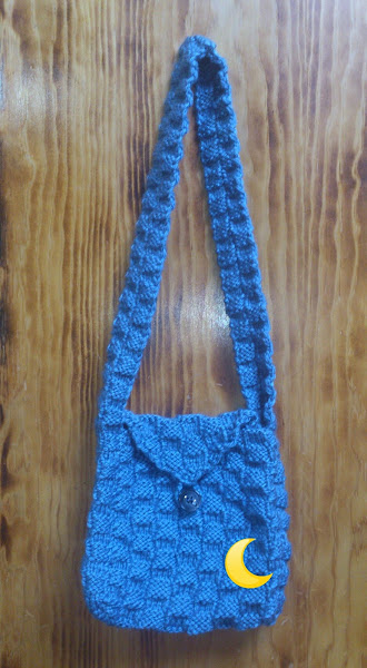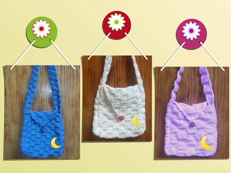 Unos bolsitos tejidos a dos agujas por mi madre. Ideales para niña o como complemento informal. De momento, en 3 colores: azul, blanco y rosa.