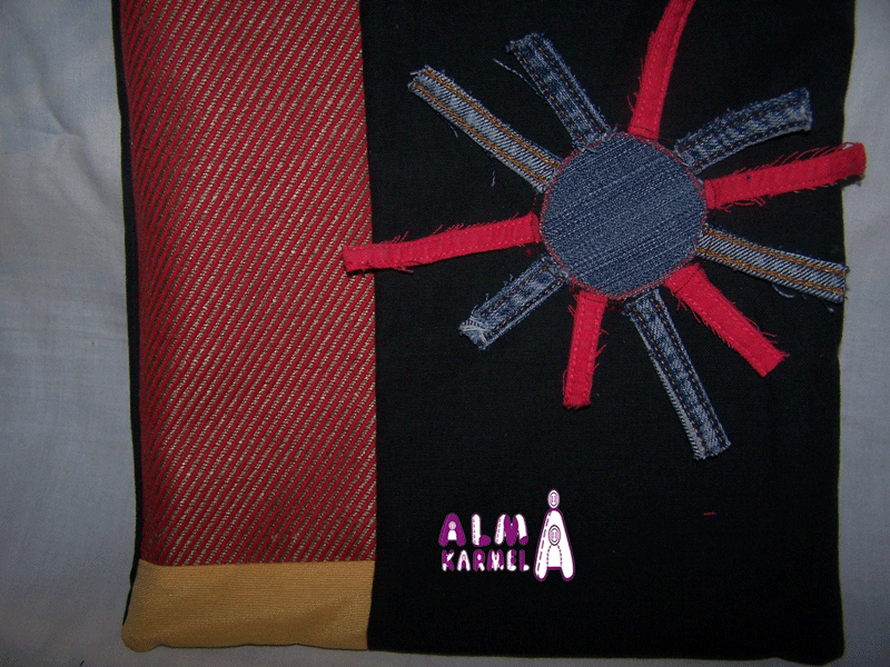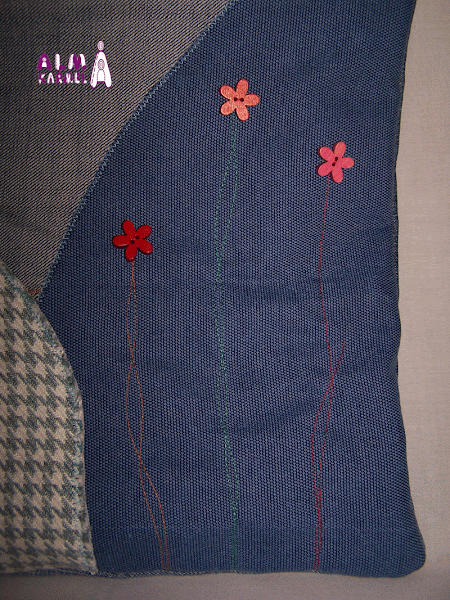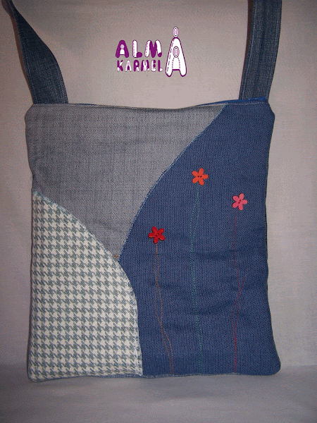 En tonos azules y decorado con botones en forma de flor. En bandolera y cerrado con cremallera.