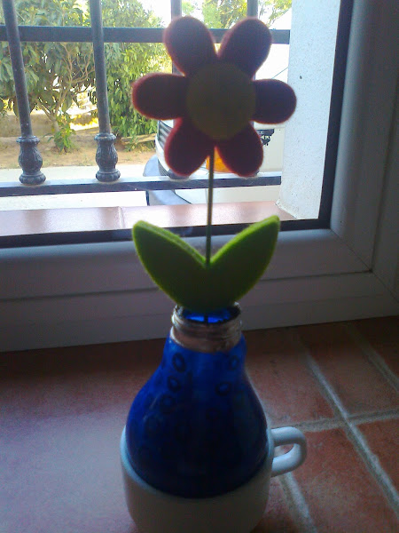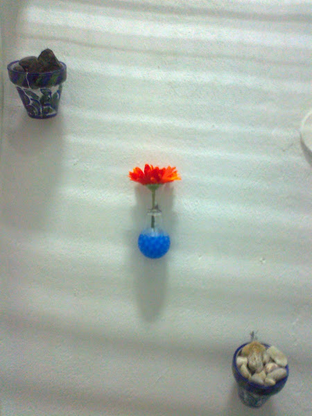 Por último, rellenamos con las bolitas y introducimos la planta o flores artificiales, y ya tenemos nuestro jarrón listo, yo le he dado un poco de coloro con pintura a las bolitas.