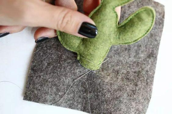 9- Cuando tengas todas las piezas armadas, coser la parte inferior de los cactus en fieltro marrón, dependiendo en la forma de ellos puedes usar pegamento para tela si lo deseas.
