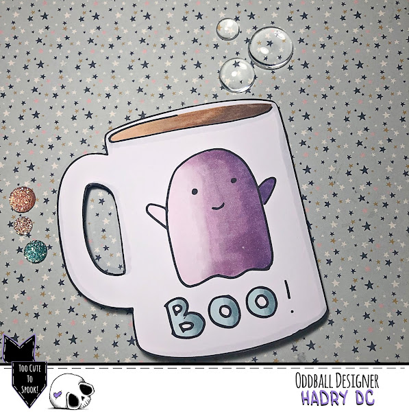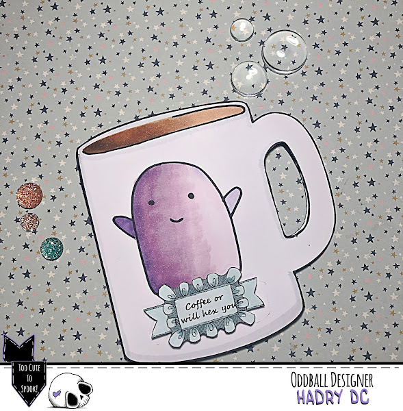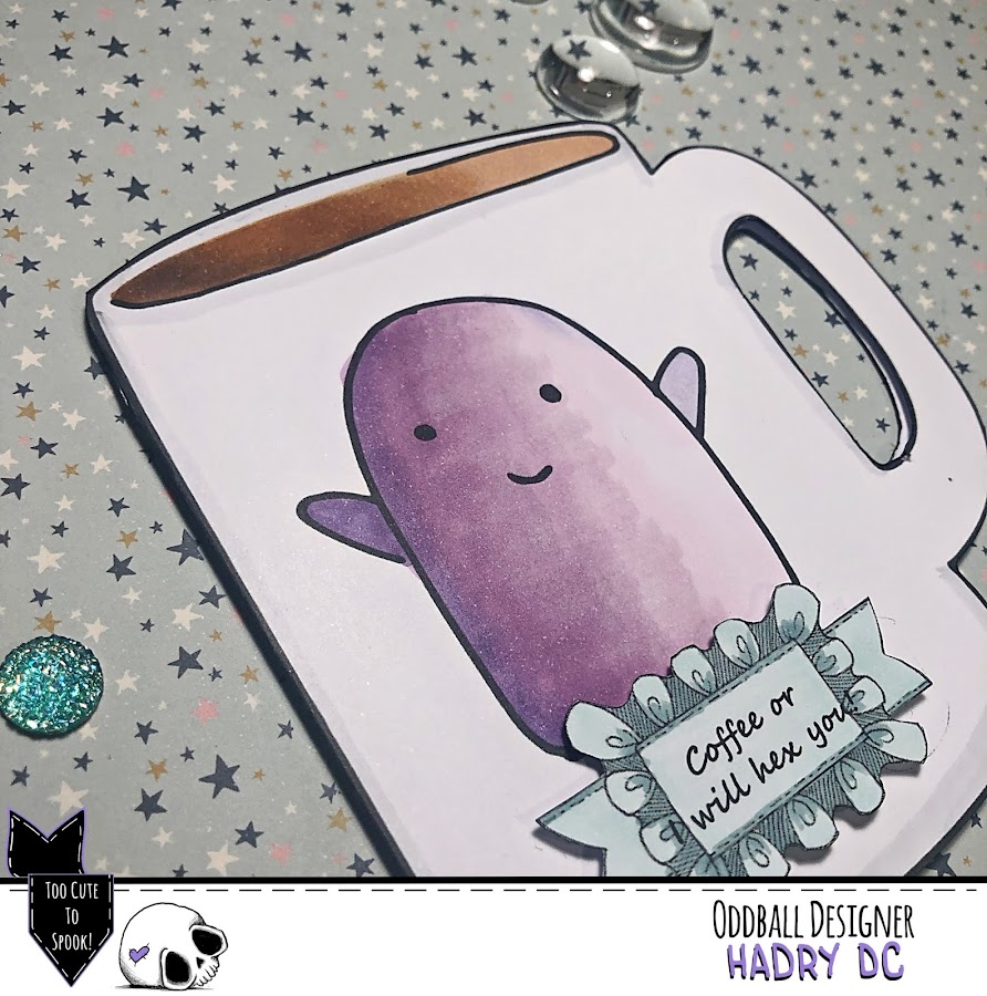 Today I prepared a simple card with some of the digis she has designed, a cup with the phrase "Coffee or I will hex you!" Ive placed on a banner image # 203 of Oddball Art Stamps colored with Copic.