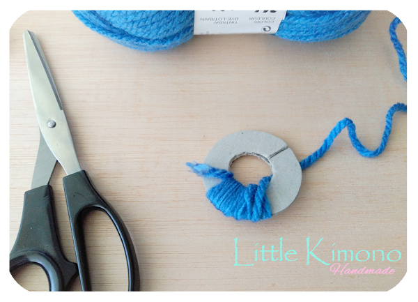 4. Pasamos entre las dos plantillas de cartón un trozo de lana y anudamos un par de veces con fuerza.
