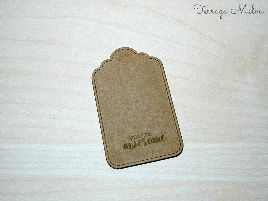 Para ocultar la parte posterior de la costura he troquelado otra etiqueta que he pegado tapando la parte "fea". En esta trasera sólamente he estampado un texto usando la misma tinta de color toffee que usé en el craquelado.