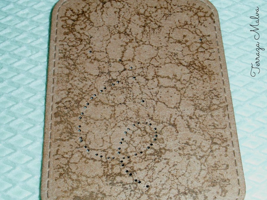 He situado la etiqueta en un corcho que sirve de mártir. Sobre ella he puesto el dibujo para marcar los puntos de costura. En este caso he utilizado un punzón de pergamano, pero sirve un alfiler o una aguja para taladrar la cartulina en donde se coserá.