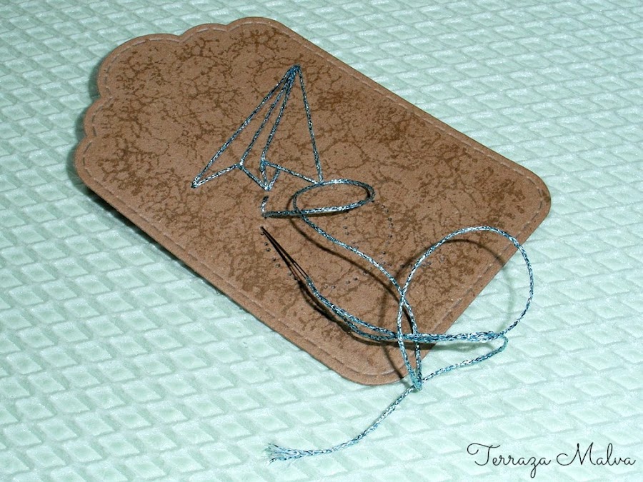 Yo he cosido con un hilo metalizado que he usado otras veces en labores de punto de cruz pero puede utilizarse cualquier tipo de hilo siempre que no sea demasiado fino (puede romper la cartulina si se tira mucho al coser y la costura no destaca) ni grueso (dificulta el paso por los agujeros y queda un resultado más tosco).