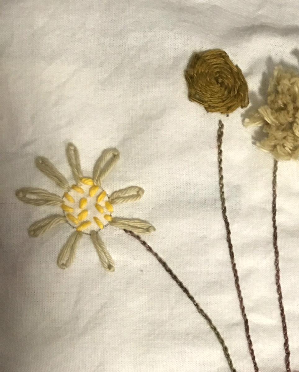 Para la flor que se encuentra a la derecha, hice un trazo en punto yerba y otro en punto hilvan, o sea pequeñas puntadas, y en el centro varios puntos en nudo francés.