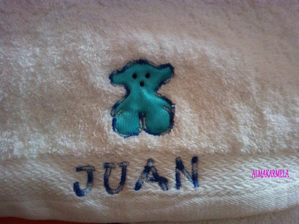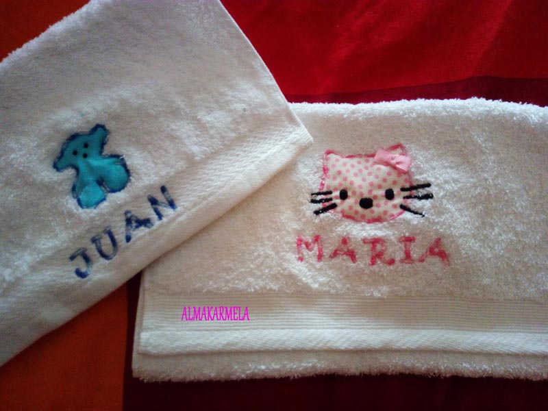 Lo primero que bordé han sido estas toallitas para mis peques, cada uno eligió el dibujo que más le gustaba y les he puesto su nombre, claro está en sus colores favoritos, no podía ser de otra manera... jejejejje