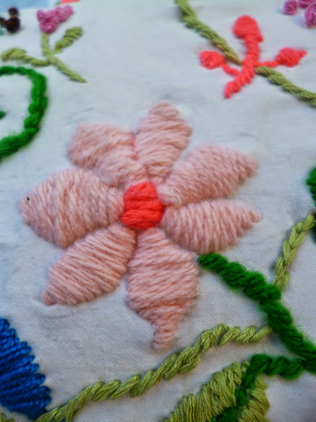 Al otro día y con lo que tenía a mano me dispuse a "bordar", y salió este diseño improvisado de no más de 15 cm. pero que me dio confianza para lanzarme a algo un poco más grande.