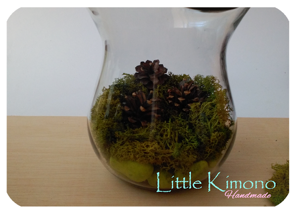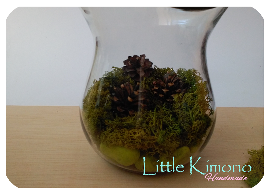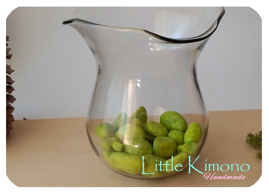 2. Colocaremos dentro de nuestro contenedor de cristal, las piedras, el musgo y las piñas...