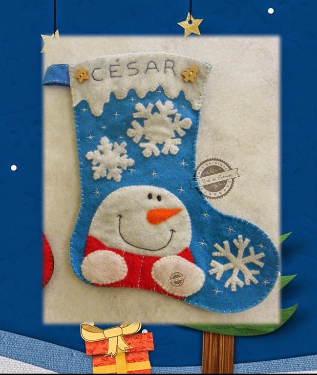 Hechas en fieltro, con hilo Dmc para los bordados y aplicaciones (no se aprecia en la foto pero las estrellitas o copos bordados del fondo están hechos con un hilo metalizado de DMC de color perlado). El tutorial (chulísimo) de la bota del muñeco de nieve lo encontraréis aquí. El reno busqué por google "bota navidad fieltro reno" y la que me gustó, cayó. Los botones de madera de estrellitas y abetos los podéis encontrar en mi tienda http://mislanitas.es.
