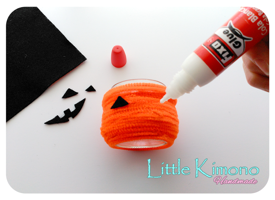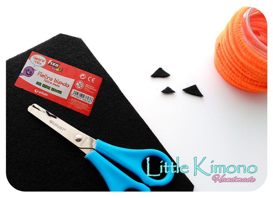 4. Con el fieltro negro haremos los ojos, nariz y la boca de la calabaza, podemos hacerlo con una plantilla o un truco es cortar las puntas del fieltro dos más grandes y la otra un poco más pequeña para la nariz, para la boca cortamos una especie de boca sonriente y luego cortamos los dientes, dos arriba y uno abajo ;) y los pegamos sobre el frasco.