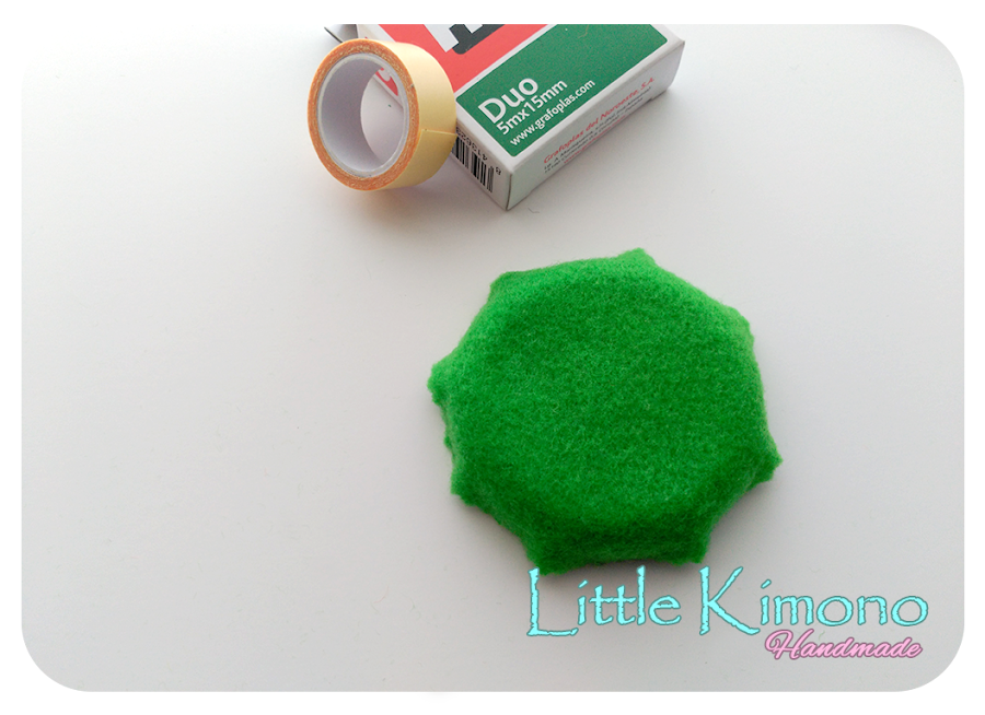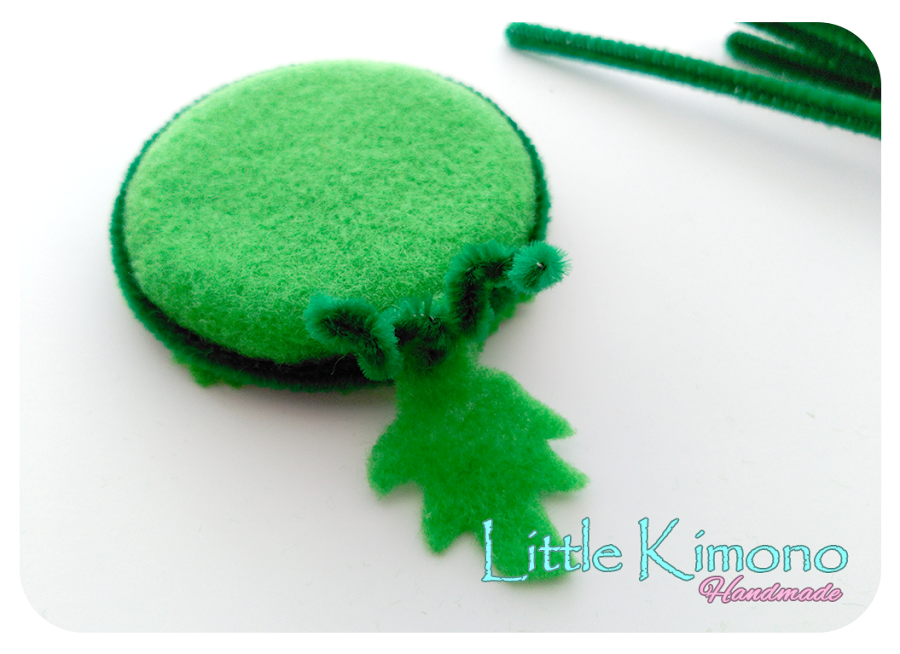 6. Con el mismo fieltro verde cortamos una hojita y atravesamos "el tallo" con el limpiapipas verde al que le colocaremos también unos trozos de fixo dúo y lo atamos alrededor de la tapa atando los dos extremos para que se sujete...
