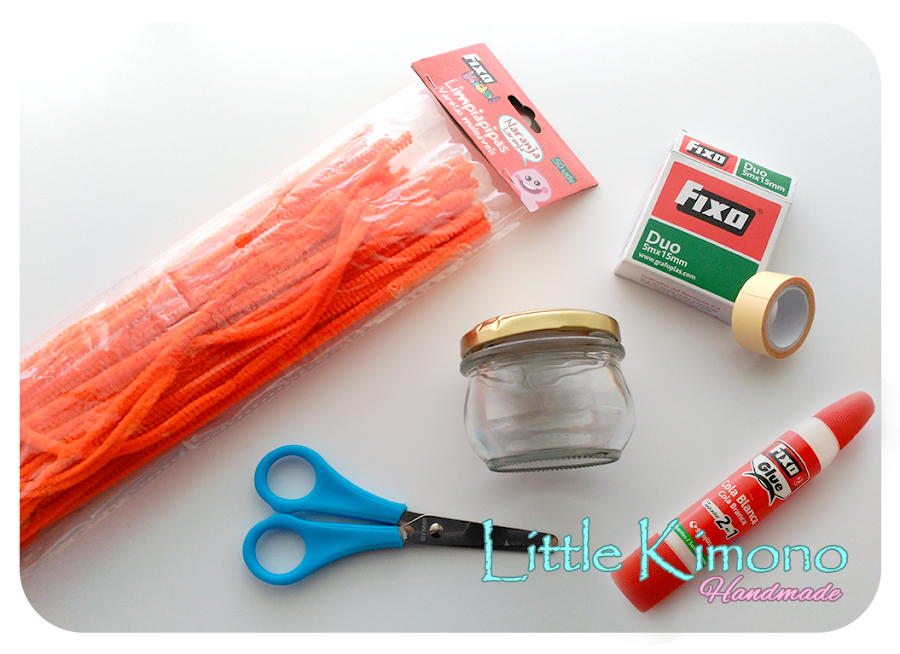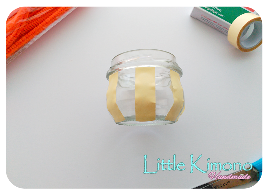 2. Retiramos los papeles protectores de la cinta y ahora podemos ir colocando los limpiapipas color naranja alrededor del frasco.