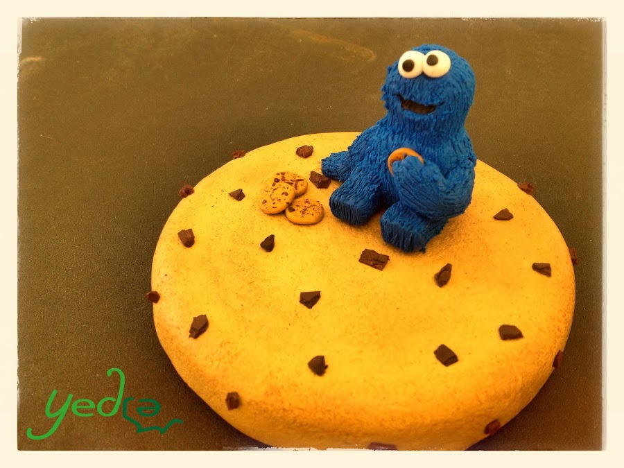 Un bote de galletas enorme cuya tapa era de 10 cm y que la propietaria quería que le decorara con el monstruo de las galletas. Después de ver la tapa se me ocurrió decorarla como una gran galleta sobre la que descansara Triki super contento y aquí está el resultado ;). Quedó genial y espero que a su dueño le encantara como regalo de estas Navidades.