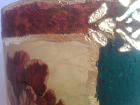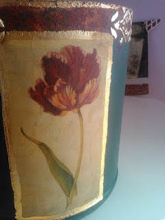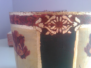 Previo a trabajar con esta superficie hay que lijar para que la sup. se quede porosa y así lograremos un agarre mejor de la pintura. posteriormente se hace un Decopage , Craquelado, Técnica de relieve con un plantilla de sténcil y al final un dorado a la hoja .