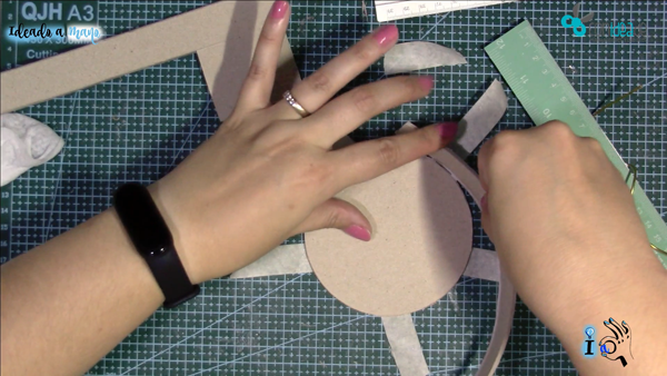 Luego mido el perímetro del bote y corto una tira de este cartón con la largura del perímetro y una altura de 2,5cm. Al ser tan estrecha puedo utilizar una plegadera o algo duro para darle una forma curvada, y así pegarlo alrededor del círculo que he hecho, utilizando cola blanca.