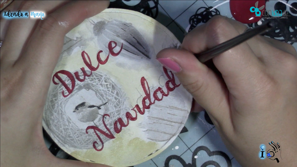 Luego un lettering en la tapa que diga Dulce Navidad, utilizando un pincel fino y pintura carmin. Le doy unas sombras plateadas y unos puntos de luz con un bolígrafo blanco. Cuando ha secado barnizo tanto la tapa como el bote.