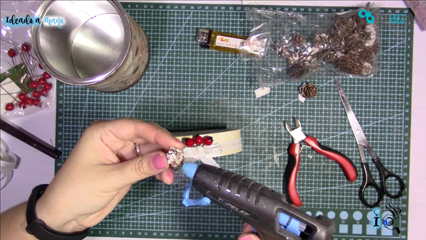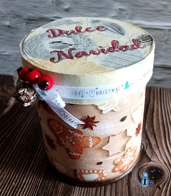 Y para dar el toque final coloco rodeando el borde de la tapa un lazo navideño, y le ponto unos frutos rojos, un lazo de la misma cinta y una minipiña. Y listo!