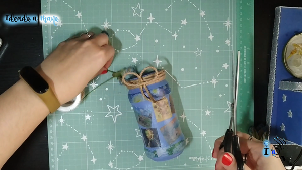 Rodeo toda la boca con la cuerda, pegándola con la pistola de silicona, y hago también un lacito con esta misma cuerda.