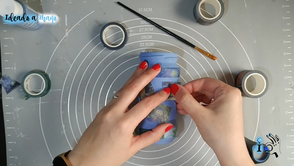 Al acabar barnizamos todo el bote, para protejer y evitar que se puedan despegar los washis con el uso. Y luego llega el momento de poner un poco más bonita la boca del frasco, que eso de que se vea la rosca no hace bonito...