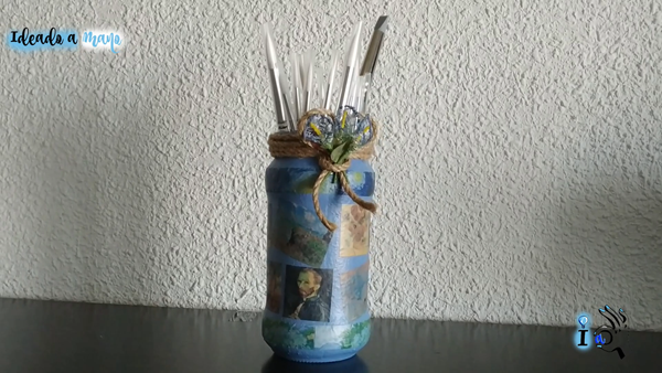 Luego pego las florecitas, un trocito más de cuerda para cerrar el lazo y manualidad terminada! Así de sencillo tenemos un bote para los pinceles, brochas de maquillaje, lápices, pinturas, rotuladores... lo que querais...
