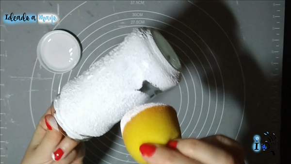 Lo primero es escoger el bote de la forma que nos guste, gastar lo de dentro, y limpiarlo bien, tanto por dentro como por fuera. Hay que quitar bien los restos de etiquetas y pegamento. Luego voy a aplicar con esponja una capa de gesso, que hará de imprimación y evitará que se descascarille, pero si tenéis alguna otra imprimación para vídrio o cristal también vale.