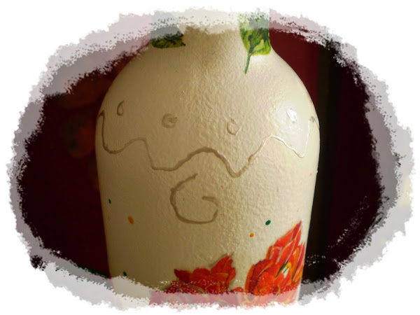 Se me ocurrió hacerle un punteado de distintos tonos, verdes, rojos y naranjas a toda la botella. Lo hice con la punta de un palillo( reconozco que no me atrevo ha hacer el punteado con un cepillo, siempre temo estropear el trabajo), también le puse adornos con pintura en relieve.