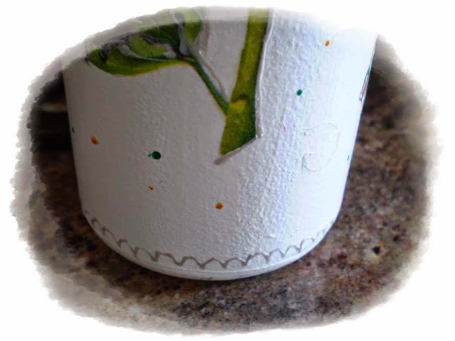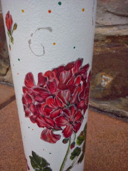 Aquí os muestro los detalles de la pintura en relieve y el punteado. Incluso le dí por algunos bordes de las flores, con esa pintura, para darles un toque, digamos, de profundidad.