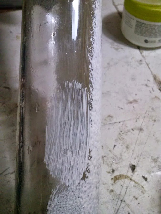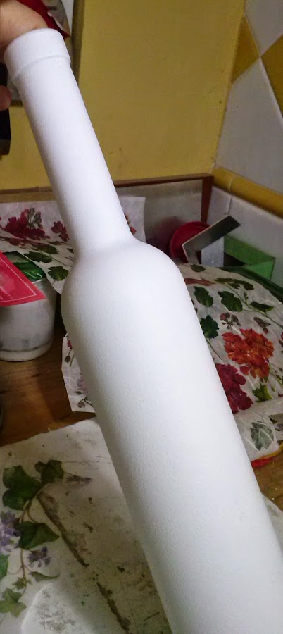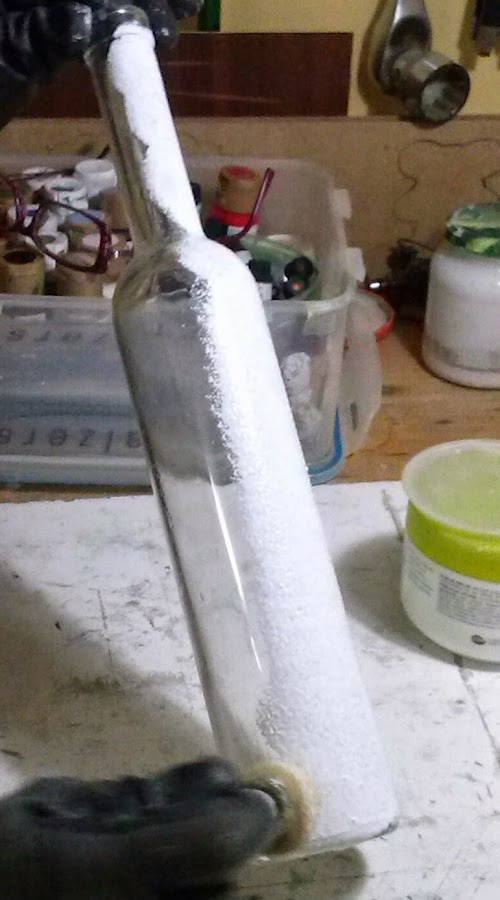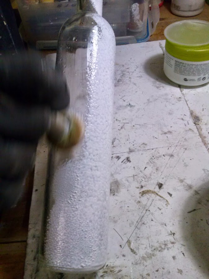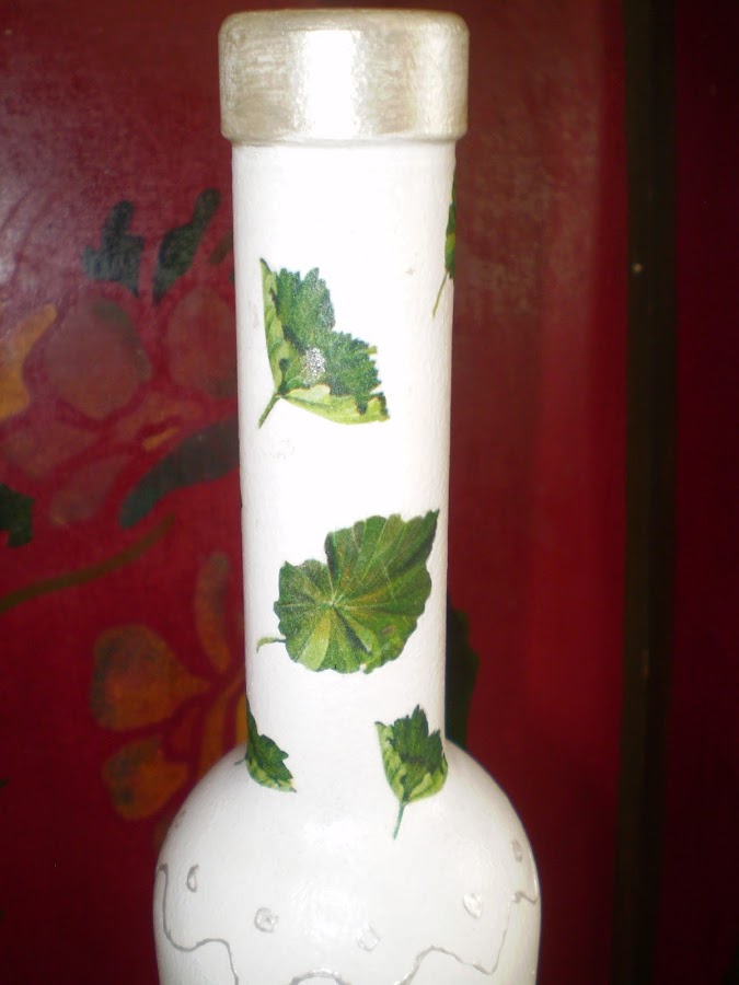 Pinte de metal plateado el cuello y luego con la misma cola blanca, le di una pasada a toda la botella para que todo quedase igual.