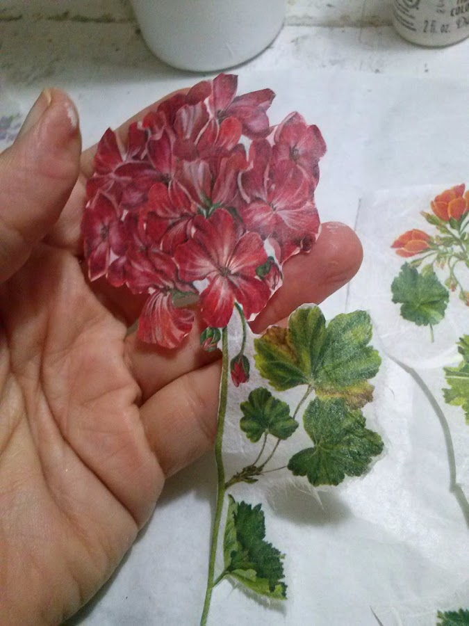 Pongo el motivo y lo pego directamente con cola blanca disuelta un poco en agua (más o menos en proporción 70/30)ni muy espesa ni muy aguada.Si preferís podéis utilizar cola decoupage directamente.
