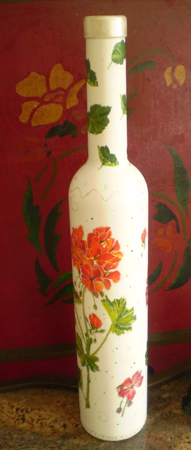 Como veis, es una botella de licor. Se me ocurrió pintarla y adornarla con decoupage, esta vez el papel que utilicé fue papel de arroz.