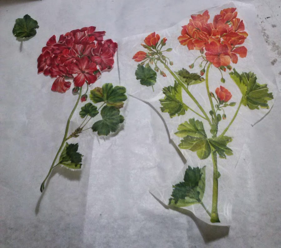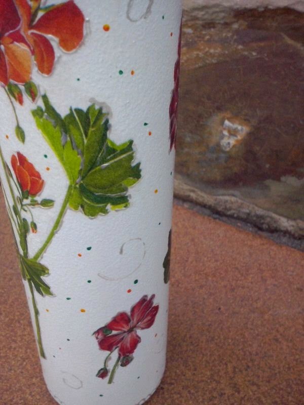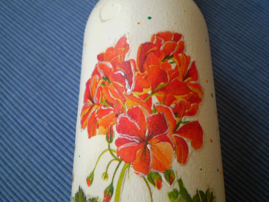 Utilicé un papel de arroz con motivos florales. Recorte algunos trozos con tijeras y otros con la mano para que se integrasen lo mejor posible sobre el fondo blanco de la botella.
