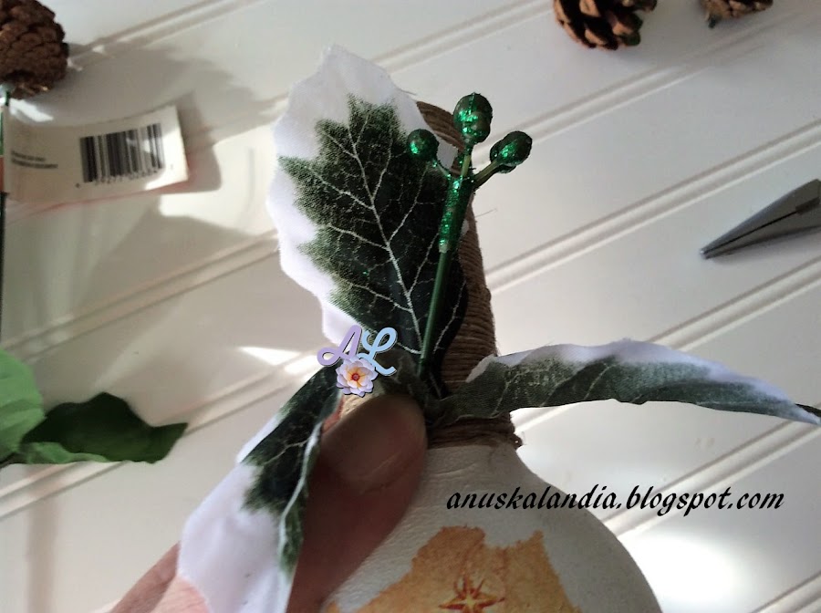 5.- Cogemos el ramillete con piñas del dollar tree, "alias los chinos". En mi caso le he quitado tres hojitas y una piña. Pegaremos ambas con silicona.