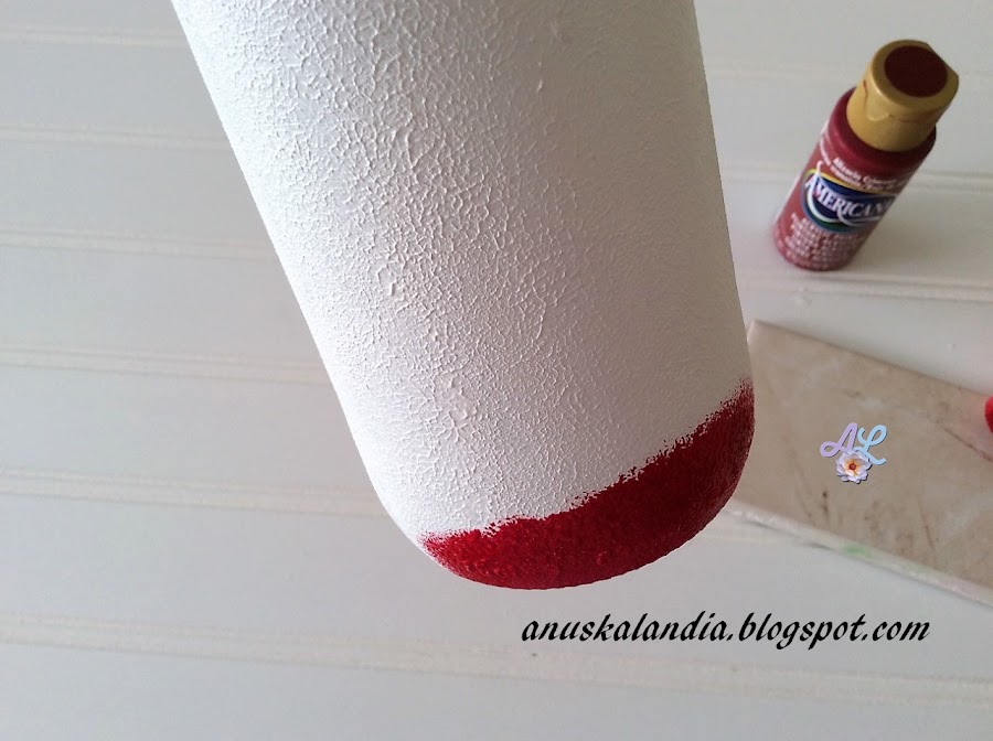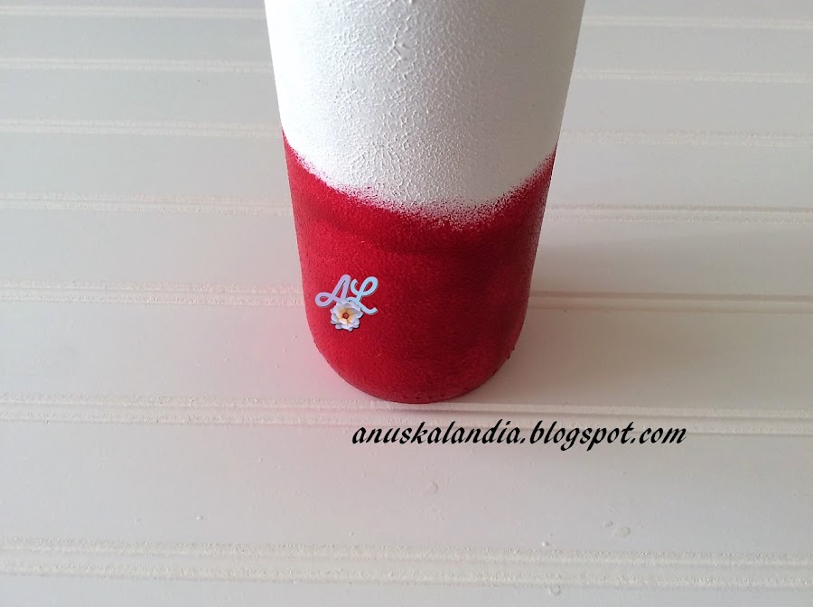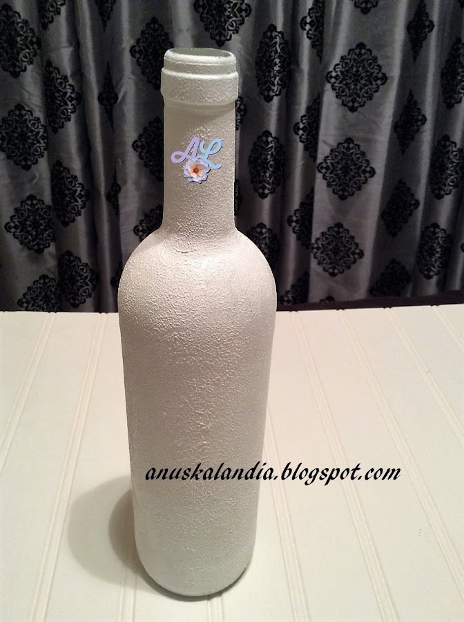 1.- Tomamos pintura blanca con la esponja y pintaremos toda la botella de blanco, dando ligeros golpecitos, no tomaremos excesiva pintura o se nos quedarán manchurrones y chorreará.