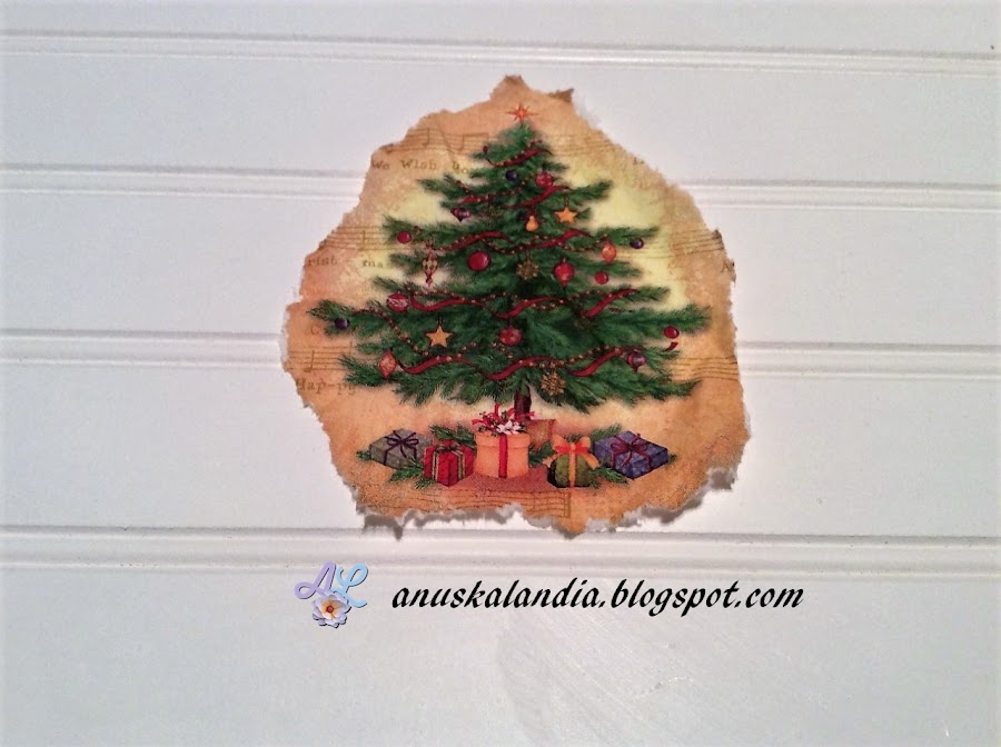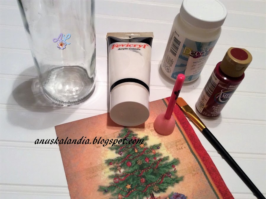 3.- Ahora vamos con la servilleta. Esta fue otro de los materiales del kit que me envío Anna de DIY Aprendiendo de todo un poco. Esta vez, siguiendo los consejos de todo el mundo, no recorte la servilleta si no que la rasgué. Separé la capa superior de las otras dos capas. Coloco para ver donde quedará definitivamente y le pongo pegamento de decoupage. Coloco la servilleta, procurando que no se arrugue. Pongo encima un acetato y froto con un algodón, para eliminar las posibles arrugas.