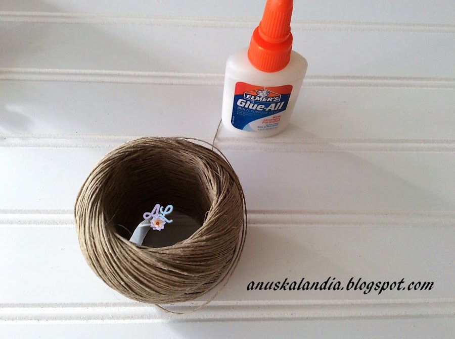 4.- Vamos con el hilo, cuerda o como se llame y la cola blanca. Ponemos un poco de ella con un pincel, en el cuello de la botella, y empezamos a enrollar ese fino hilo, alrededor del mismo. Vamos poniendo cola, poco a poco, seguimos enrollando hasta que tengamos todo el cuello envuelto.