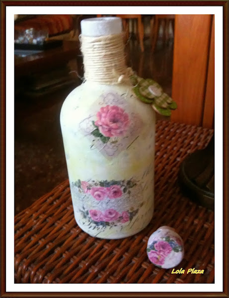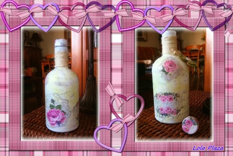 Hola Chicas!!! Hoy os traigo una botella de cristal que he decorado.Primero la he pintado de blanco, he hecho un decoupage, perlitas, florecillas , piculina lazos ........ Una mariposa de madera pintada en blanco aguado en rosita, no te parece romántica????? El papel de rosas que he utilizado , lo he envejecido muy suavemente. Y con ella participo en el cumpleblog de mi amiga Cecili E ...