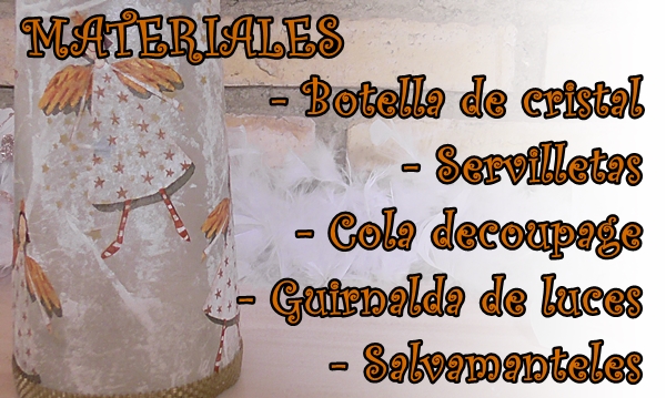 Para conseguir que la botella sea translúcida utilizo una servilleta blanca y se la pego por todo el cristal. Mientras se seca recorto los angelitos que llevaba la servilleta, con mucha paciencia eso si, y también recorto grupitos de estrellas de otra servilleta, que en esta ocasión me la regaló nuestra querida Francis del blog Una vida real un cielo de persona y una gran artesana con la lana afieltrada.