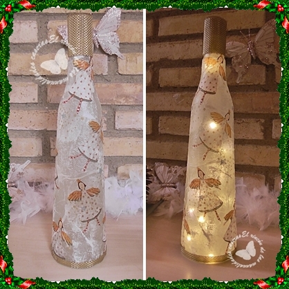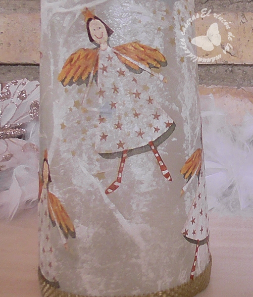 Una vez todas las piezas recortadas empiezo hacerle el decoupage por la botella de manera alternada, sin ningún patrón, un angelito por aquí, otro por allí, un grupito de estrellas entre los angelitos y así hasta que me gusta como queda y lo dejo secar.