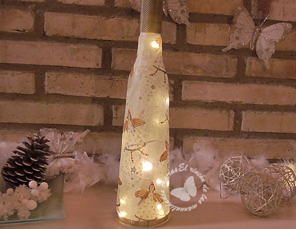 Para las luces utilicé una guirnalda que para este trabajo es perfecta, son unas luces leds y la parte donde va la pila y el interruptor tiene forma de tapón de corcho, lo coloco dentro y para ocultar el tapón, que es un poco feo, utilizo un salvamanteles de plástico en color dorado, le va genial, hago una especie de tapa con un rectángulo con la medida de la boca de la botella, lo enrrollo y lo pego con silicona caliente, le añado un circulo del mismo material y listo, como si fuera un sombrero de copa pero sin ala jajaja. En la base de la botella a modo de decoración le pego una tira de 1 cm de ancha del mismo salvamanteles y lista la botella con luces.