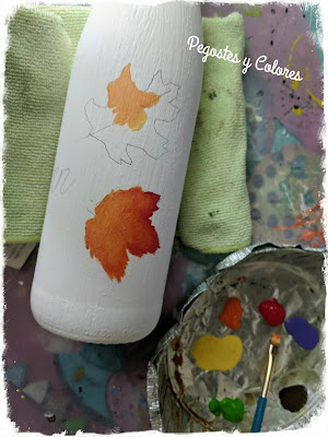 2.- Una vez seca la pintura, a lapiz le hice dibujos de hojas y escribi la palabra "Autumn".