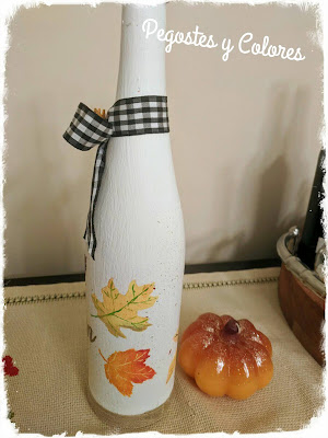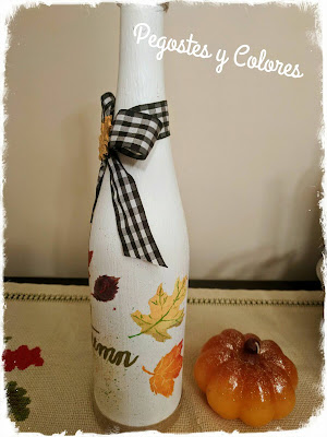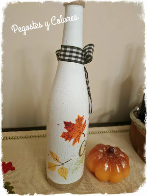 Asi que aqui estoy con mi botella, que termino de una forma inesperada, porque me quede tinta para mi impresora. Originalmente iba a ser un simple decoupage sobre una botella pintada de blanco... Pero las circunstancias me hicieron cambiar y pintar con pinturas acrilicas.Que bueno, me entretuvo mas pero al final me dio gusto practicar mas la pintura a mano alzada y sobre todo practicar mas con acrilica y salir mas de mi zona de confort, porque por lo general no salgo de la acuarela y pastel.