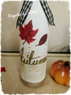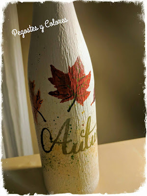 4.- Cuando las hojas quedaron a mi gusto, deje secar la botella. Luego con un cepillo viejito de dientes, salpique la botella con pintura acrilica diluida con poquita agua de dorado, verde y rojo, dandole un poco de mas salpicado en donde escribi la palabra.