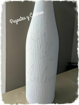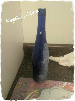 1.- Limpiar muy bien la botella, que quede libre de pegamentos y grasas. Secarla bien y darle una capa con una brocha de pintura chalk.