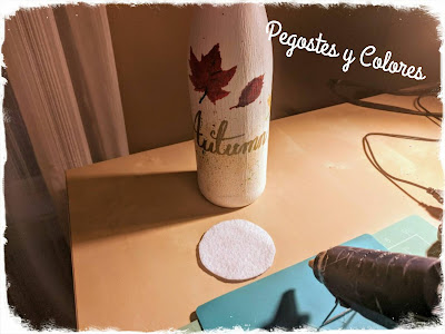 6.- Con silicona peque un circulo de fieltro del mismo tamaño de la base de la botella para evitar que raye las superficies, decoro tambien con cintas y una figura de madera en forma de hoja.