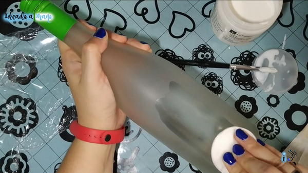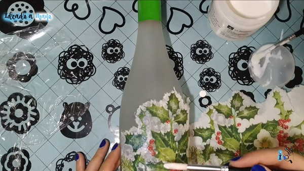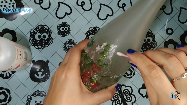 Cuándo se ha secado podemos quitar el pegamento de las zonas en las que nos hayamos salido con un bastoncillo de algodón mojado en alcohol. Luego barnizamos esta zona con barniz mate para protejer y para intentar dejar el mismo efecto que el esmerilado de la botella.