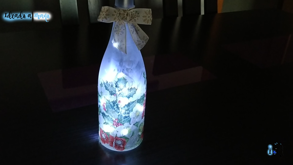 Hoy comienzo ya la temporada navideña, para que nos dé tiempo a decorar la casa tranquilamente. Y comienzo reciclando una botella, en mi caso una botella de vino blanco que tiene un efecto esmerilado que me encanta, pero también puede hacerse con una botella transparente. Vamos a usar decoupage y una guirnalda de leds para convertirla en un adorno que no sólo servirá de día sino que podrá iluminar nuestras noches. ¿Os animais?