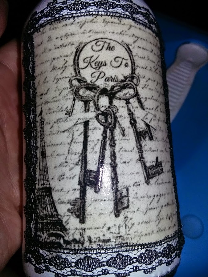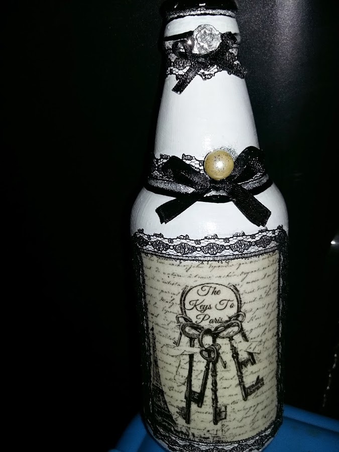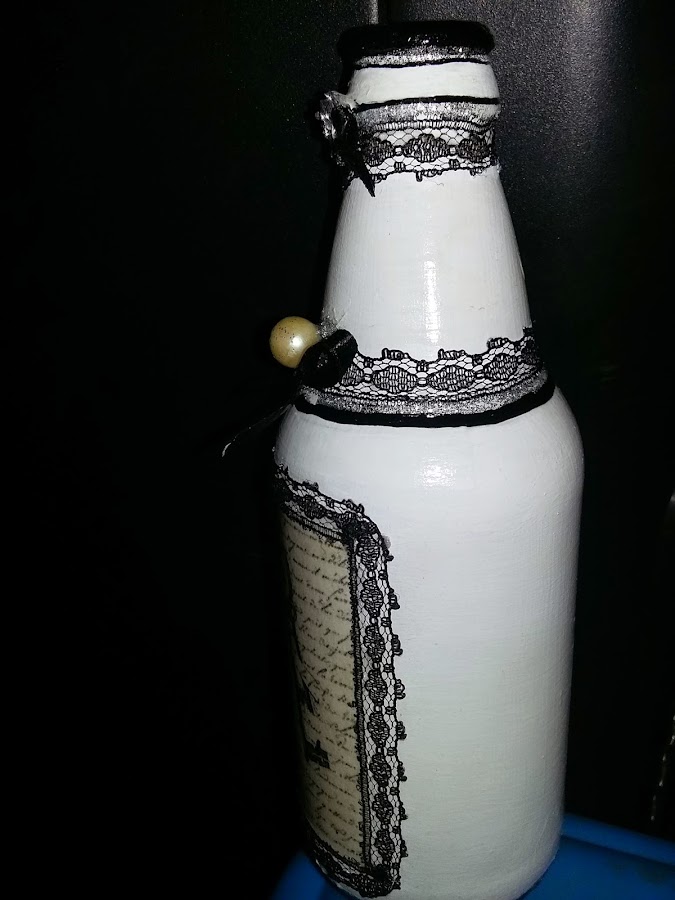 El paso a paso es super sencillo y no necesita fotos, limpiar la botella, pintarla con varias capas de blanco, hasta que no se note el color ámbar de la botella. Luego que seca bien la pintura, pegar la imagen elegida con cola blanca, con silicona fría pegar la puntilla a modo de marco de la imagen y con el resto decorar a gusto.
