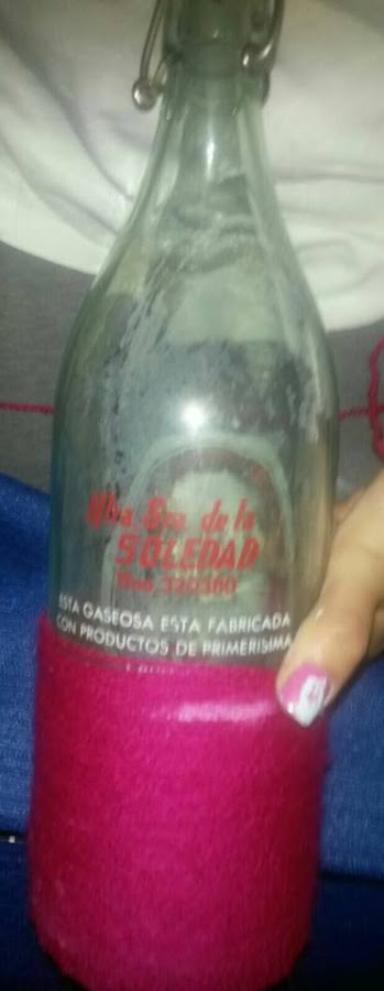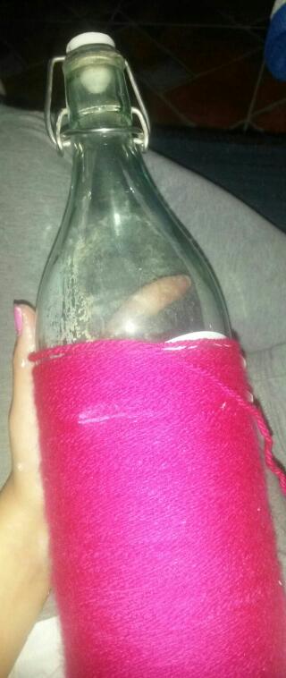 Cuando tenemos la botella bien limpia, extendemos la cola por trozos, se comienza por la zona baja de la botella, empezamos a cubrir con uno de los colores en mi caso solo con un color. La lana sobrante la cortaremos.